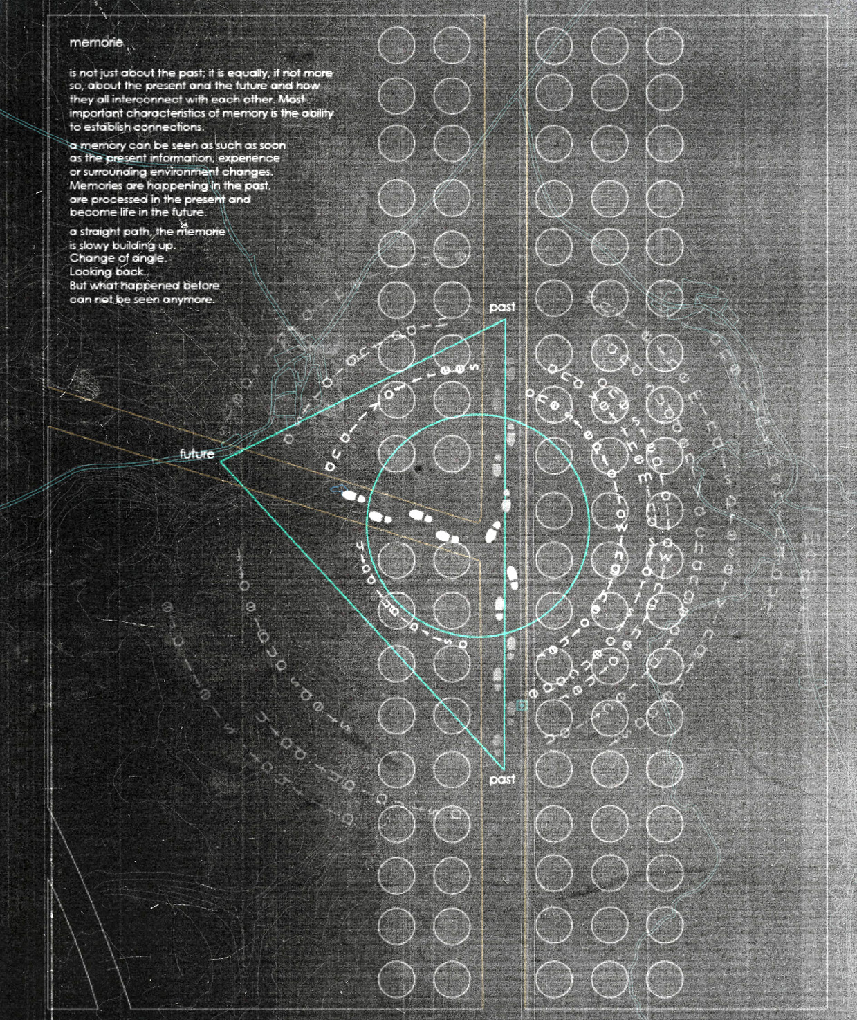 Blenheim garden has a long history with constant change of its landscape. By redrawing the lakeside landscape of Blenheim Park, the moment of memory revealed itself. One moment happened to be on a straight path, on an ally of trees. By walking, the memory is slowly building up on a slightly changing path. Suddenly another view comes up, a change of direction. We decide to take the opposite direction and when turning around, the seen cannot be seen anymore.