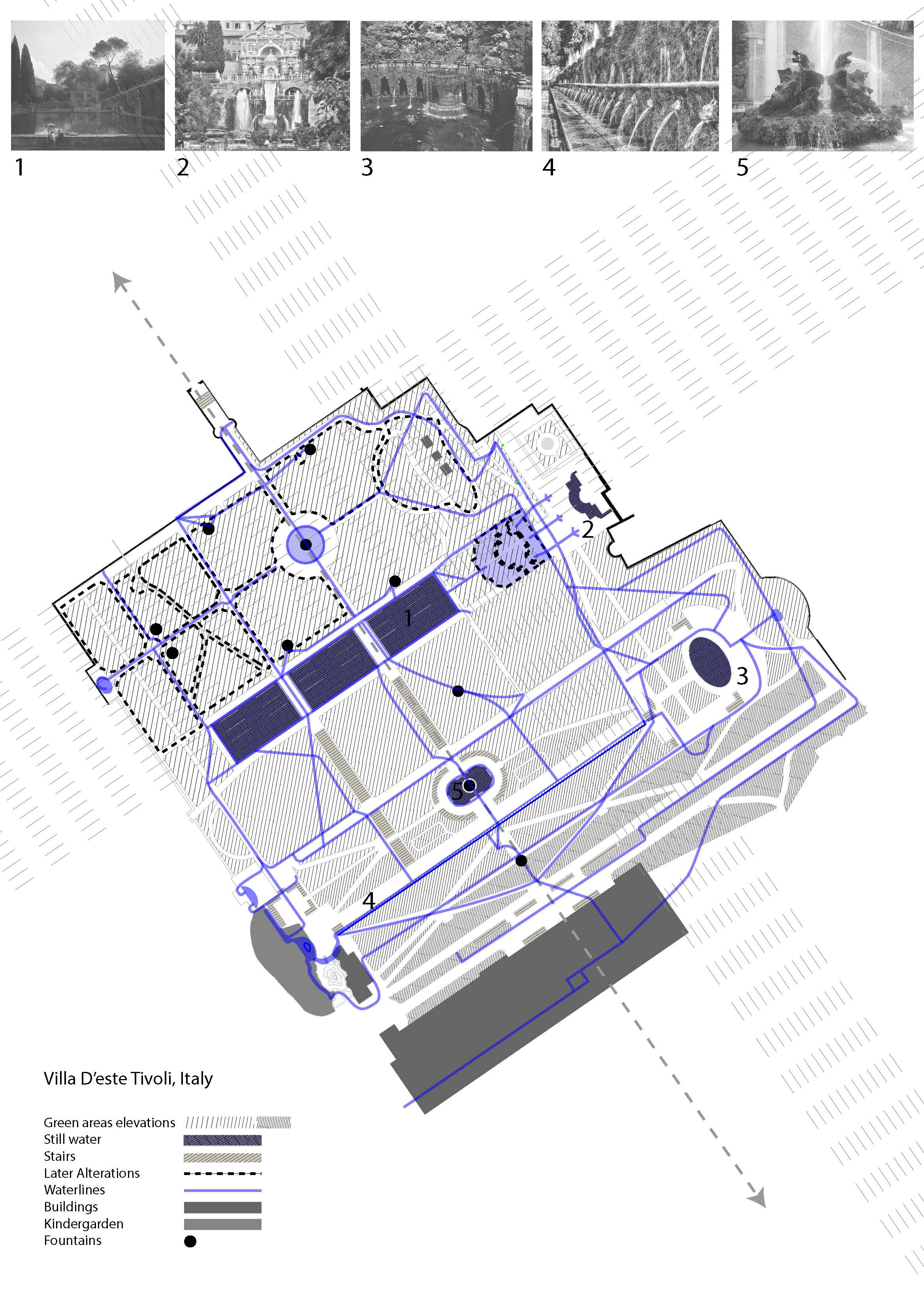 Through mapping out the shapes of the different gardens and water ponds, the paths that move in-between the elements became clearer. This garden is working with water and includes a complex subsurface water network of pipelines. And is using the topographic inclination to distribute water downwards to the different fountains and ponds.