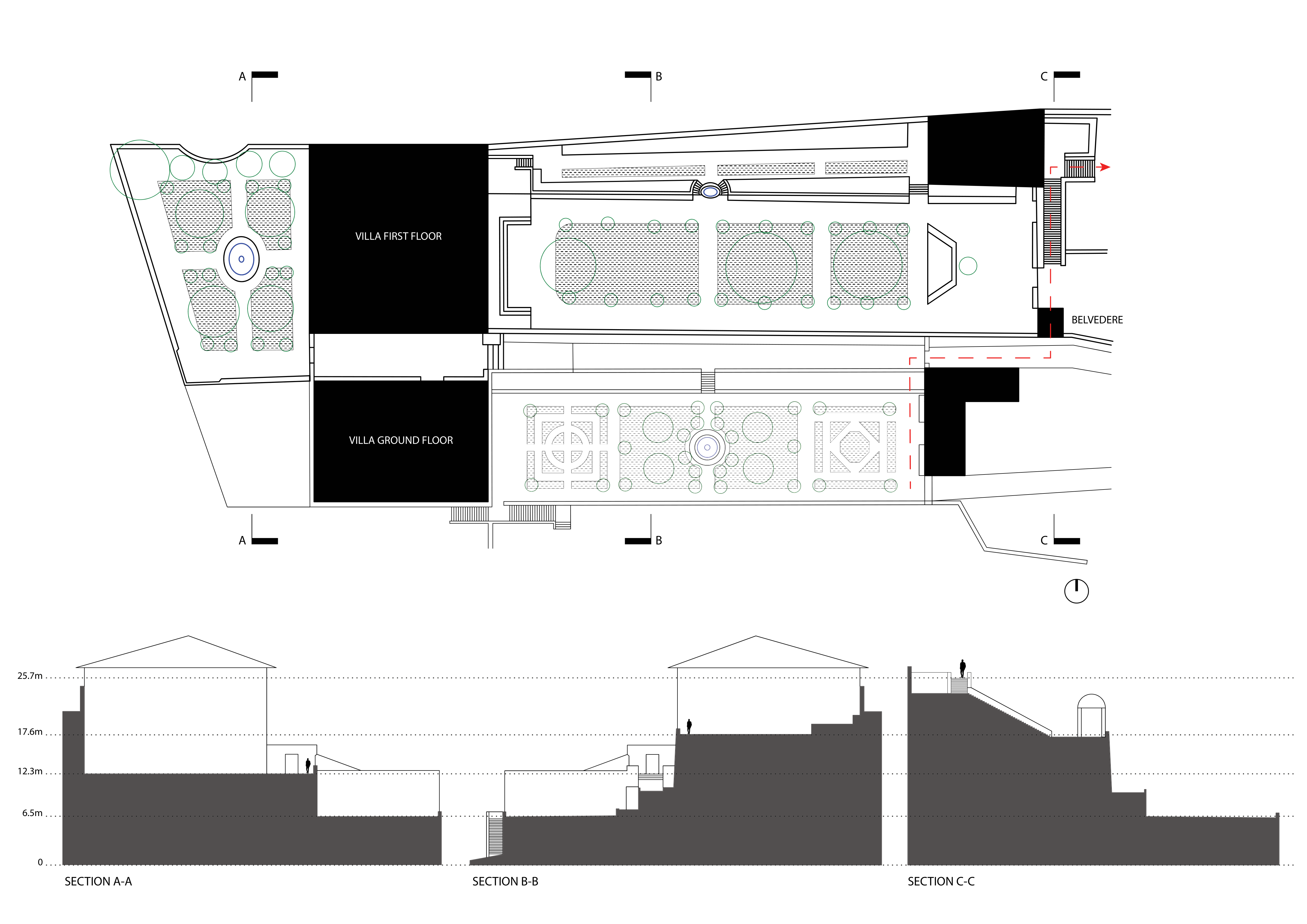 Analysis of Villa Medici, an Italian landscape garden. This was chosen due to the various levels on the site. Through digital reconstruction, the investigation was how these levels and the surrounding architectural features affect our perception of the view towards Florence.