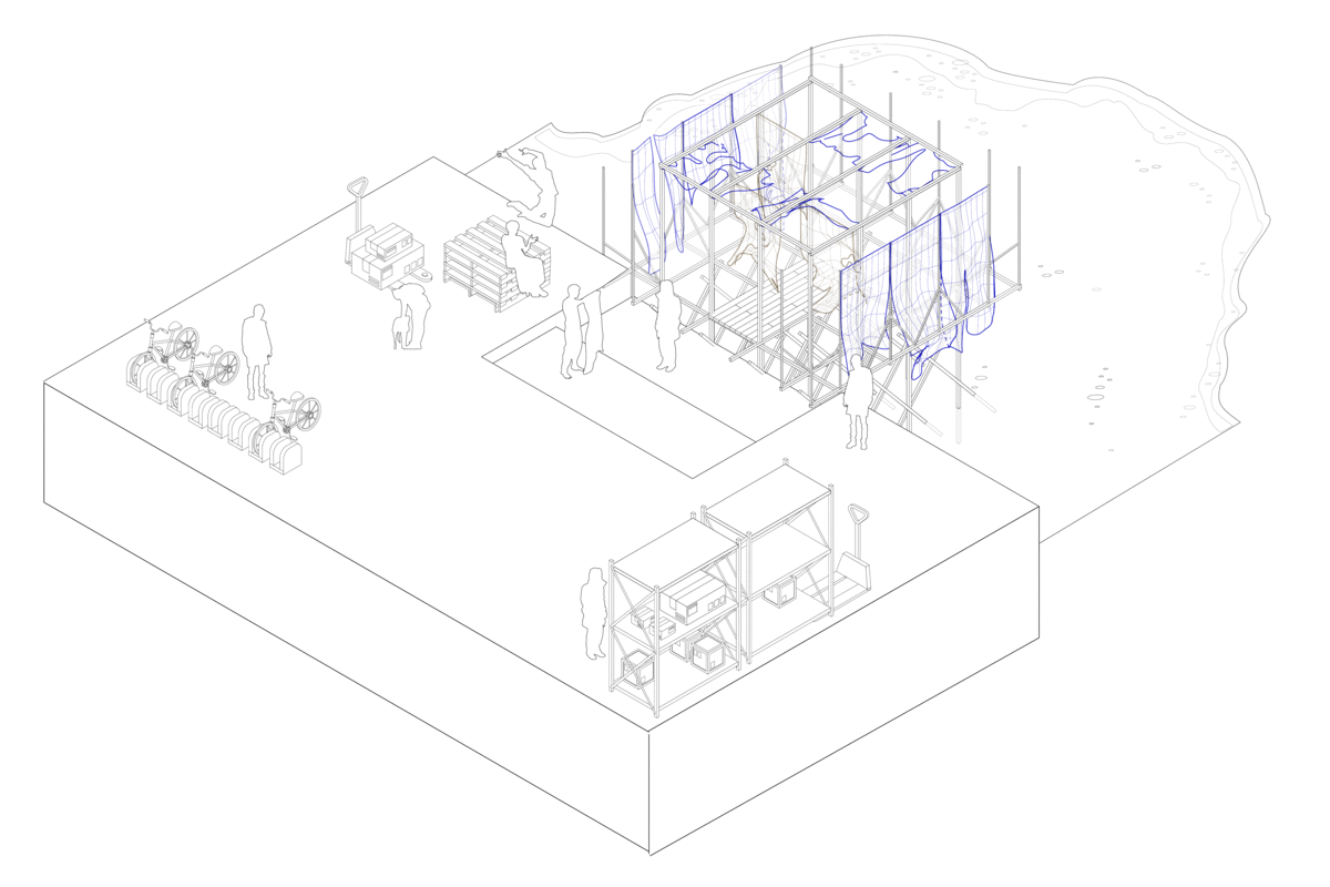 This led to the pavilion's creation. Following data research, such as wind studies within the site, it allowed for the displacement of materials within its form. The pavilion consists of dimensional lumber, whereby fabric is hung in the North and South. Leather is placed from east to west, as strong currents of wind allow for it to move within the placed tracks on the upper most past of the structure. At its initial state, the materials are presented dimensionally long enough for it to appear within the different tides. A small board walk leads to its interior, with the inner perimeter of the structure left untouched, as visitors can engage with the ocean, and the structure below.